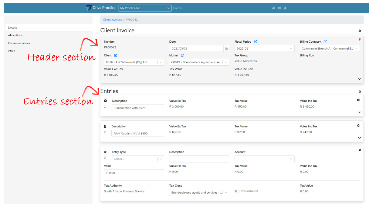 Client Invoices have four record views, a Details view, an Allocations view, a Communications view and an Audit view.