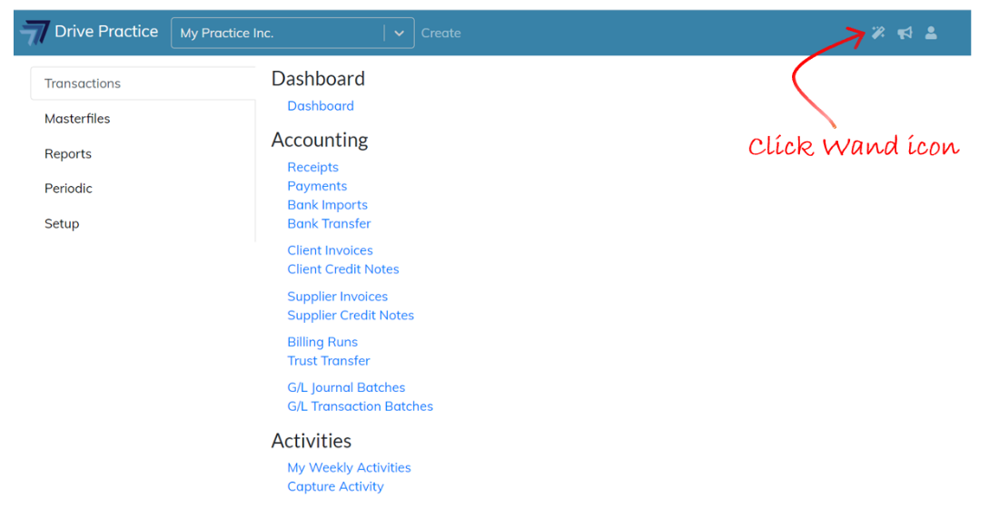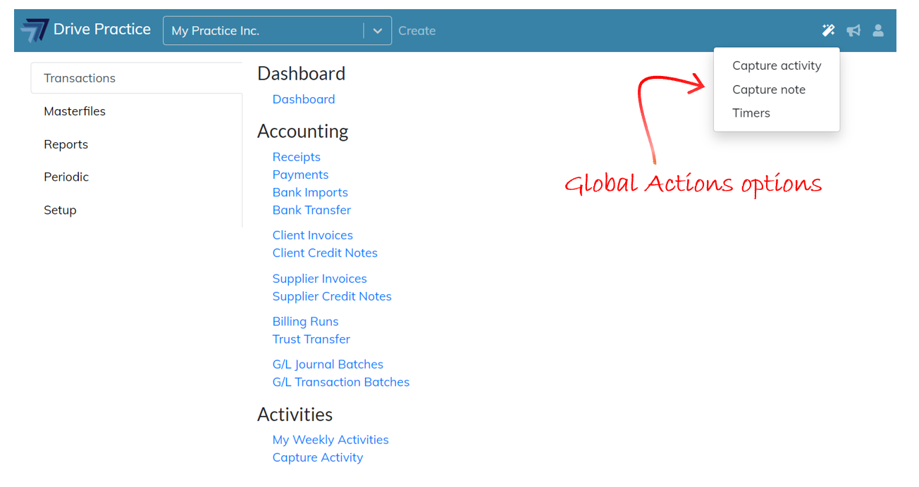Global Actions are a set of quick entry options that are accessible no matter what context the screen is currently in, for example you are currently viewing a matter’s trust details and you need to capture a note for another matter.